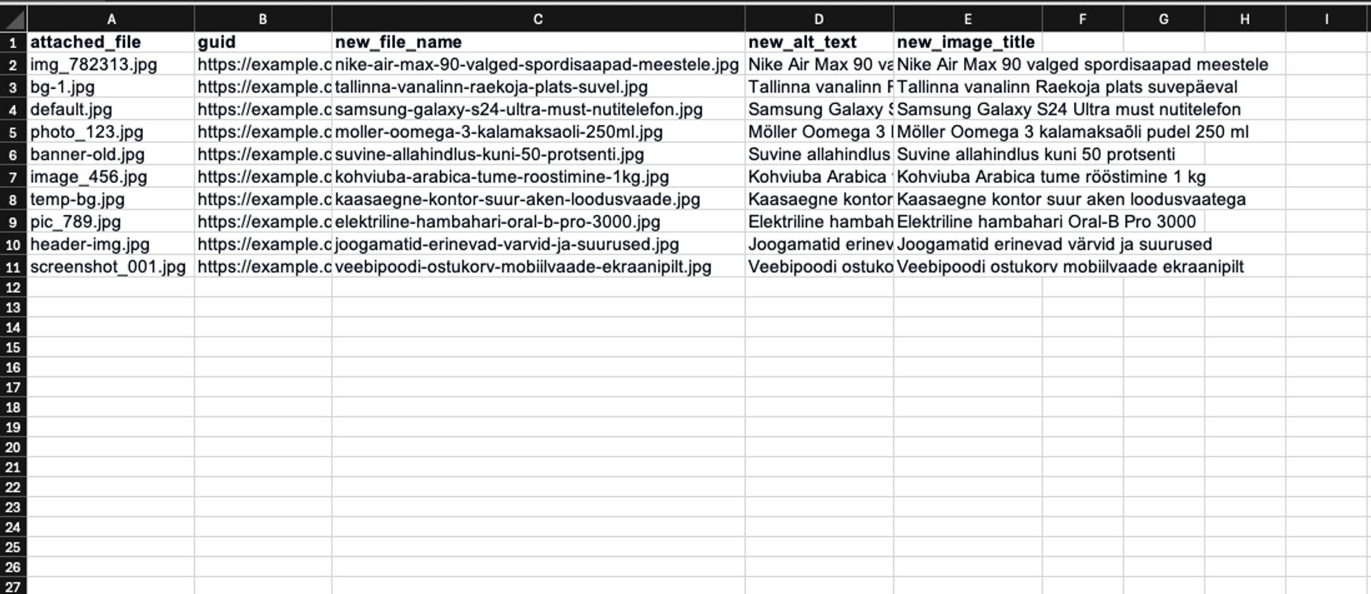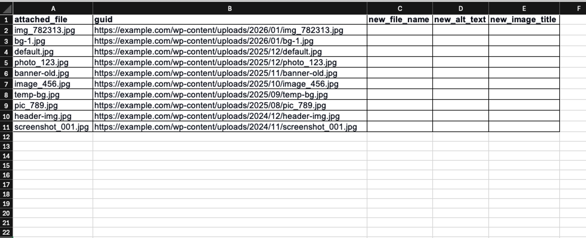 We also add extra columns: "new_file_name", "new_alt_text", and "new_image_title". This is where we’ll put the new values without clicking around in the admin panel. In the end, you’ll have a big table called "images-to-edit.csv" that you can download from the server.